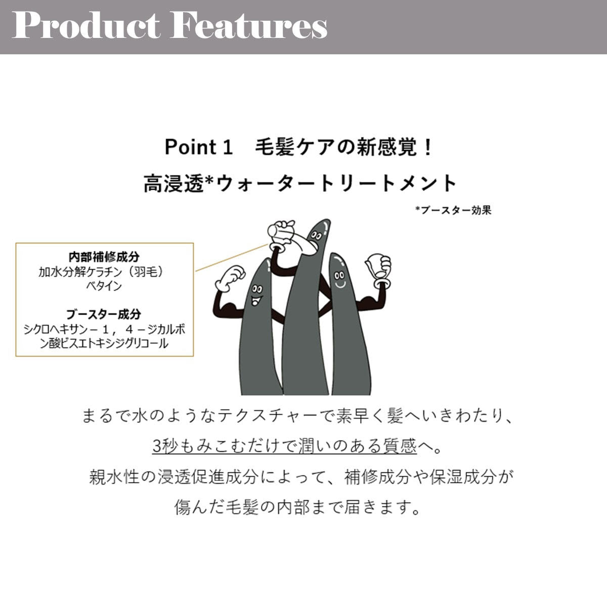 ブリーチやWカラーなどを繰り返すハイダメージ毛に 瞬時*にやわらかさと潤いを与える水トリートメント。(ウォータートリートメント)