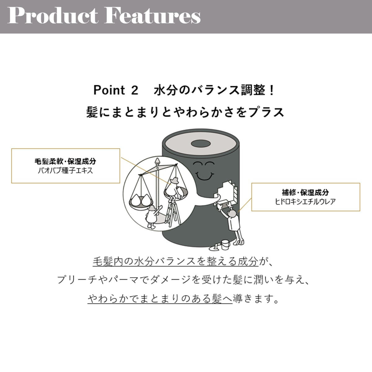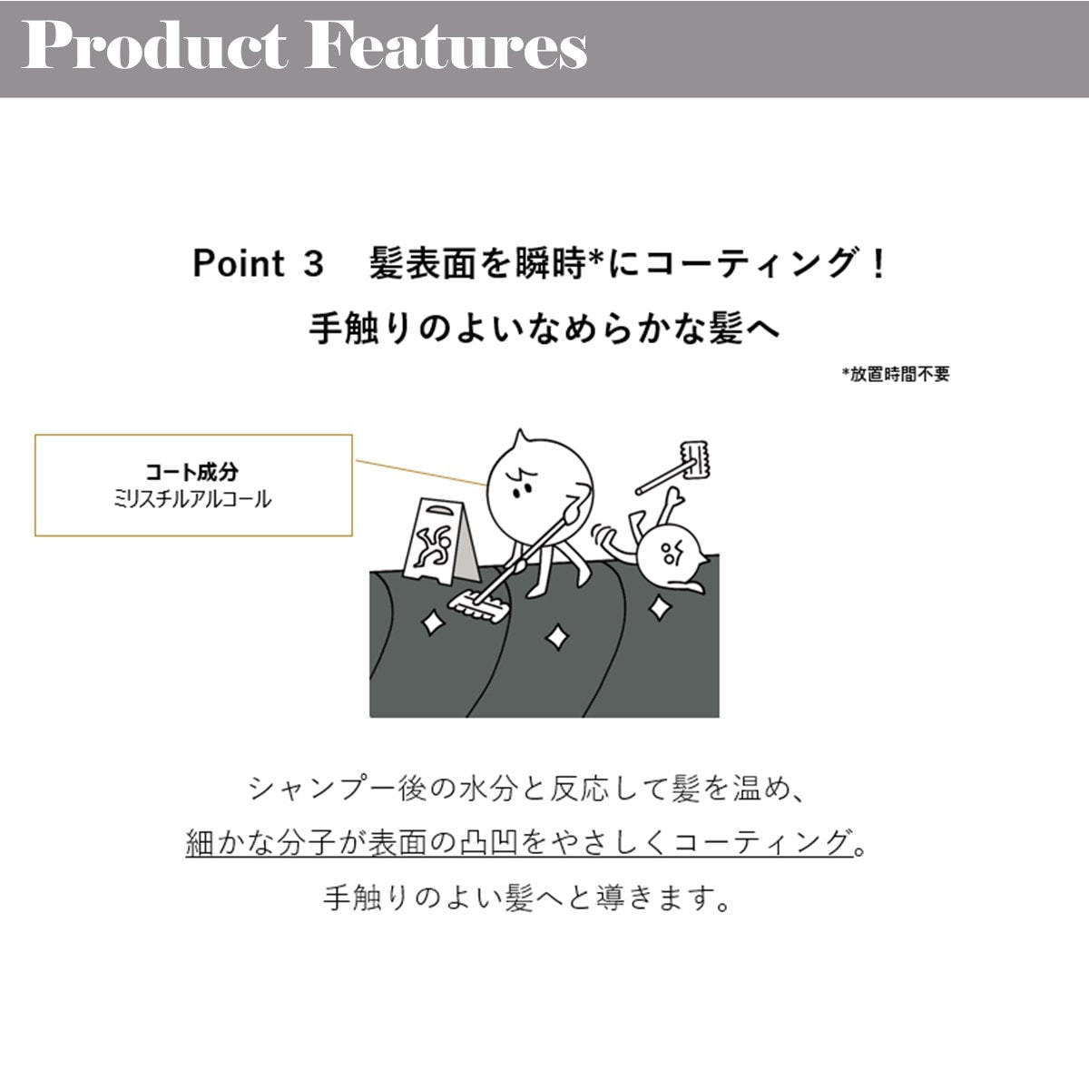 毛髪の水分バランスを整え、手触りのよい髪に導きます。*放置時間不要